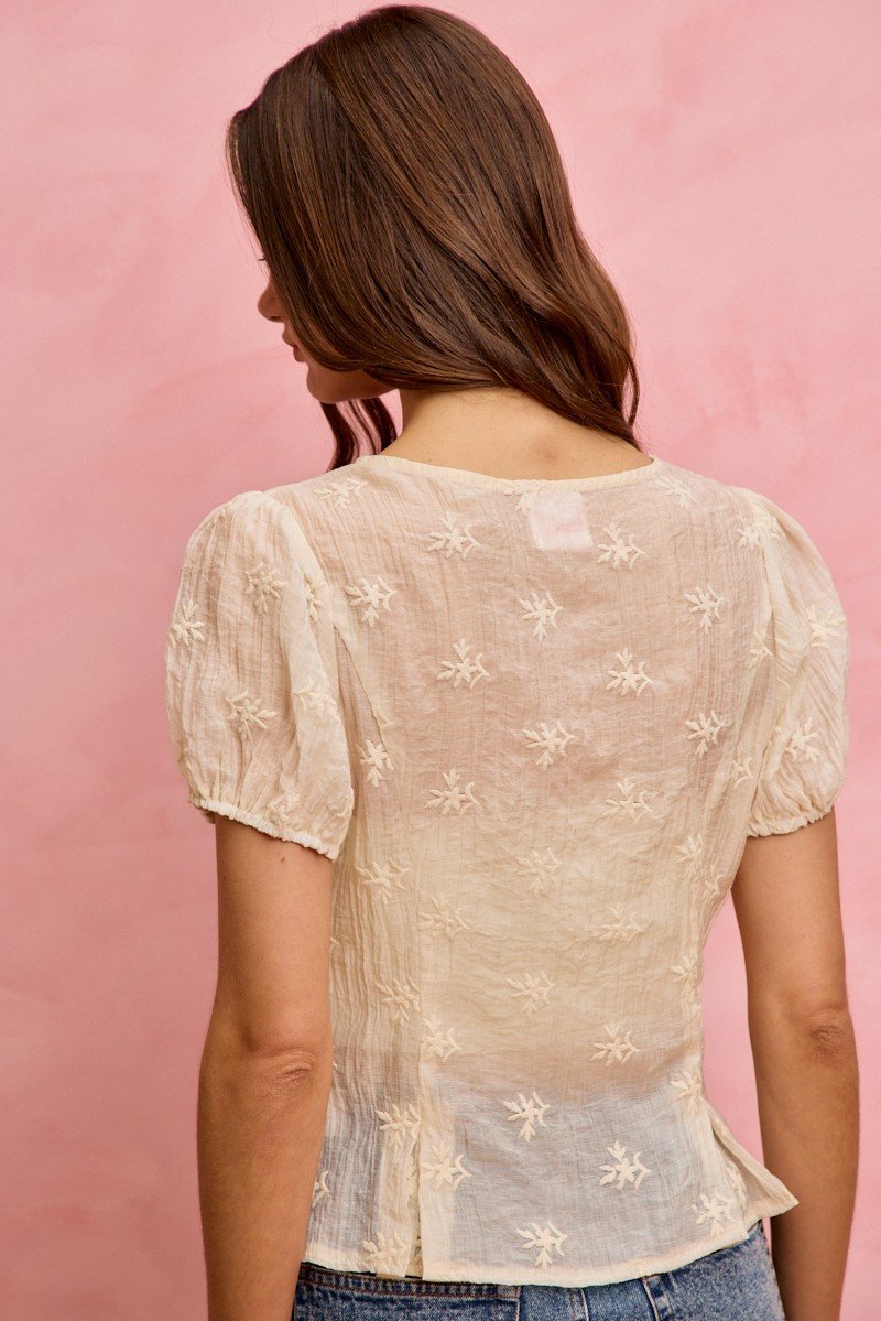 A beautifully, embroidered floral blouse. Romantic and effortlessly feminine, this lace trim blouse brings a little vintage charm with to any outfit. Designed with delicate floral embroidery and soft textured fabric. Features a flattering, fitted silhouette, dainty buttons, and scalloped neckline. Slight puff sleeves create a soft, romantic shape. Lightweight fabric for a comfortable addition to your favorite denim for an everyday look or a skirt for a sweet, elevated style.